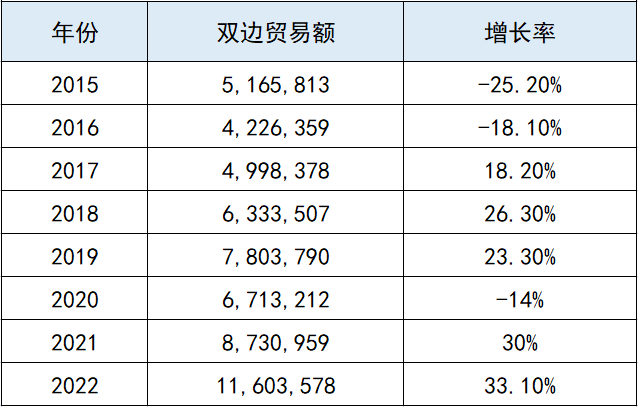 如图所示,从2015年—2022年中沙双边贸易数据看,尽管某些年度的贸易总额有下降的现象,但是整体贸易是稳步发展的状况。2015年的双边贸易额为516.6亿美元,然而在2022年,贸易总额就达到1160.4亿美元,增长率已达到124.6%。